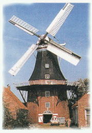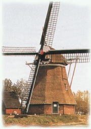 四角い風車小屋が、太い垂直の柱の上に建っており、この柱を中心として、風の吹く方向に風車の羽根を向けることができます。デルフザイル市のあるフローニンゲン州でも、見ることができます