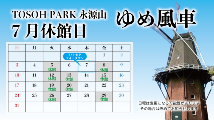 Home » お知らせ » 7月ゆめ風車休館日