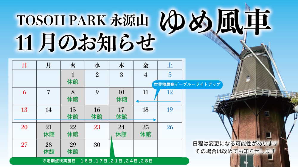 Home » お知らせ » 11月ゆめ風車休館日