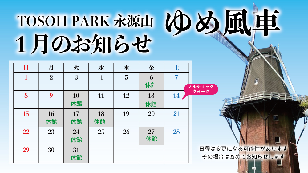 ※休館日であっても、風車山頂まではいくことができ、外観はご覧いただけます。