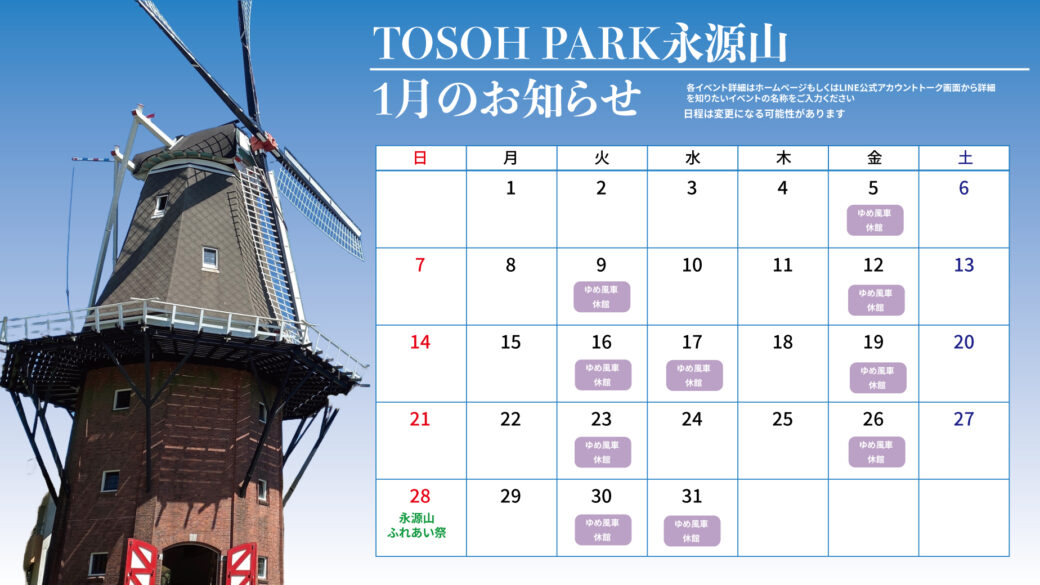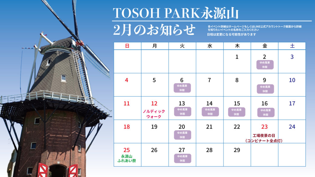 2月のゆめ風車展示室休館他スケジュールは以下の通りです