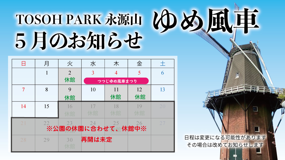 ※休館日であっても、風車山頂まではいくことができ、外観はご覧いただけます。 ※2023年5月16日現在、公園休園にて園内に立ち入ることはできません